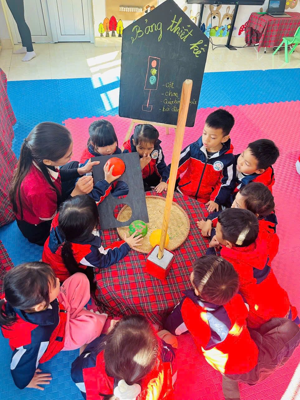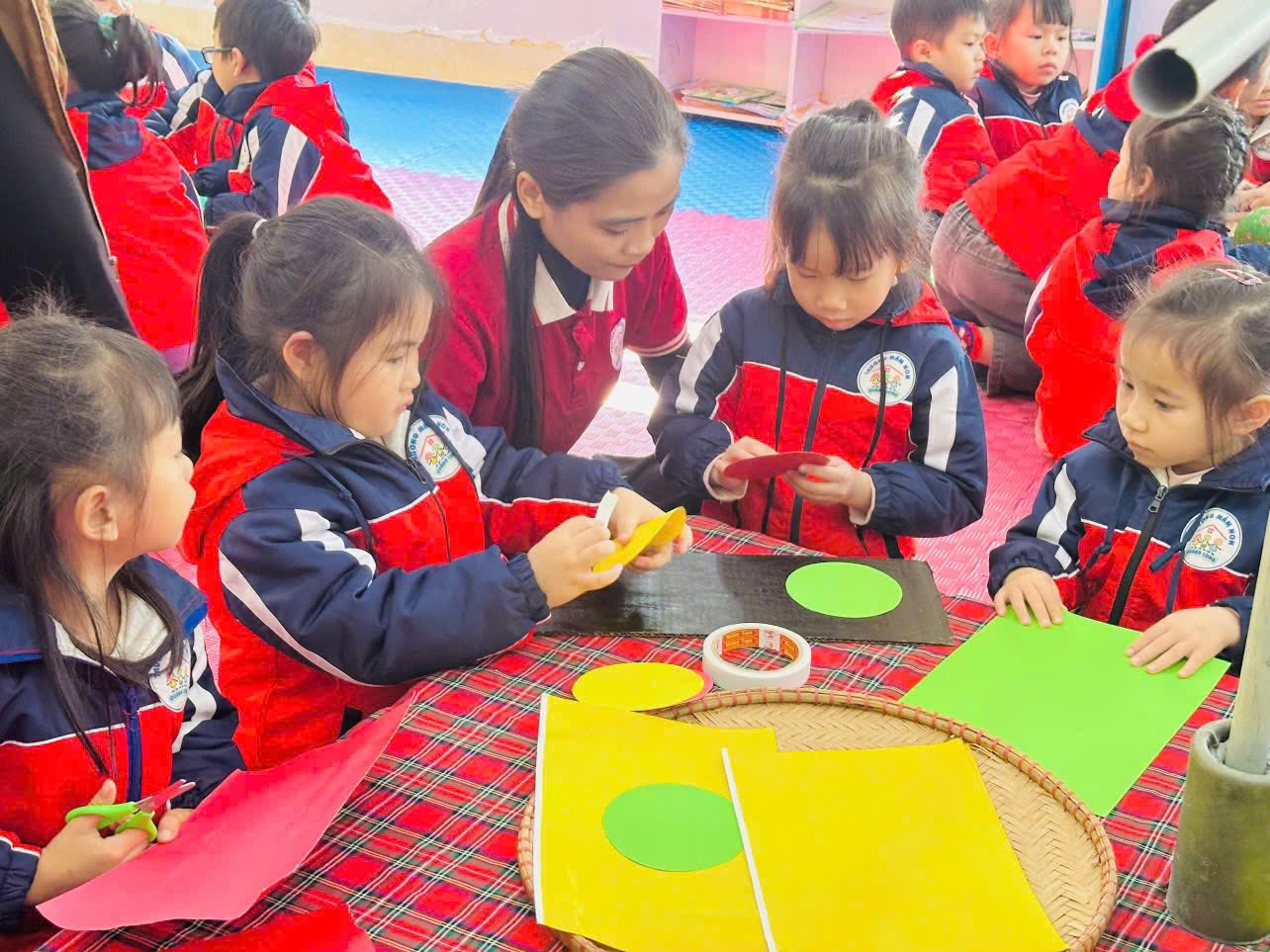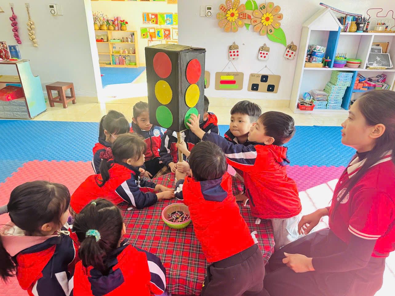 Không dừng lại ở việc “nghe – ghi chép – tiếp thu”, ngay sau buổi tập huấn, Tổ chuyên môn số 1 đã chủ động nghiên cứu sâu nội dung, cùng nhau thảo luận, chia sẻ và chuyển hóa kiến thức tập huấn thành hành động cụ thể thông qua việc xây dựng và tổ chức tiết dạy mẫu “Làm đèn giao thông” theo chu trình EDP dành cho trẻ mẫu giáo 5 tuổi.